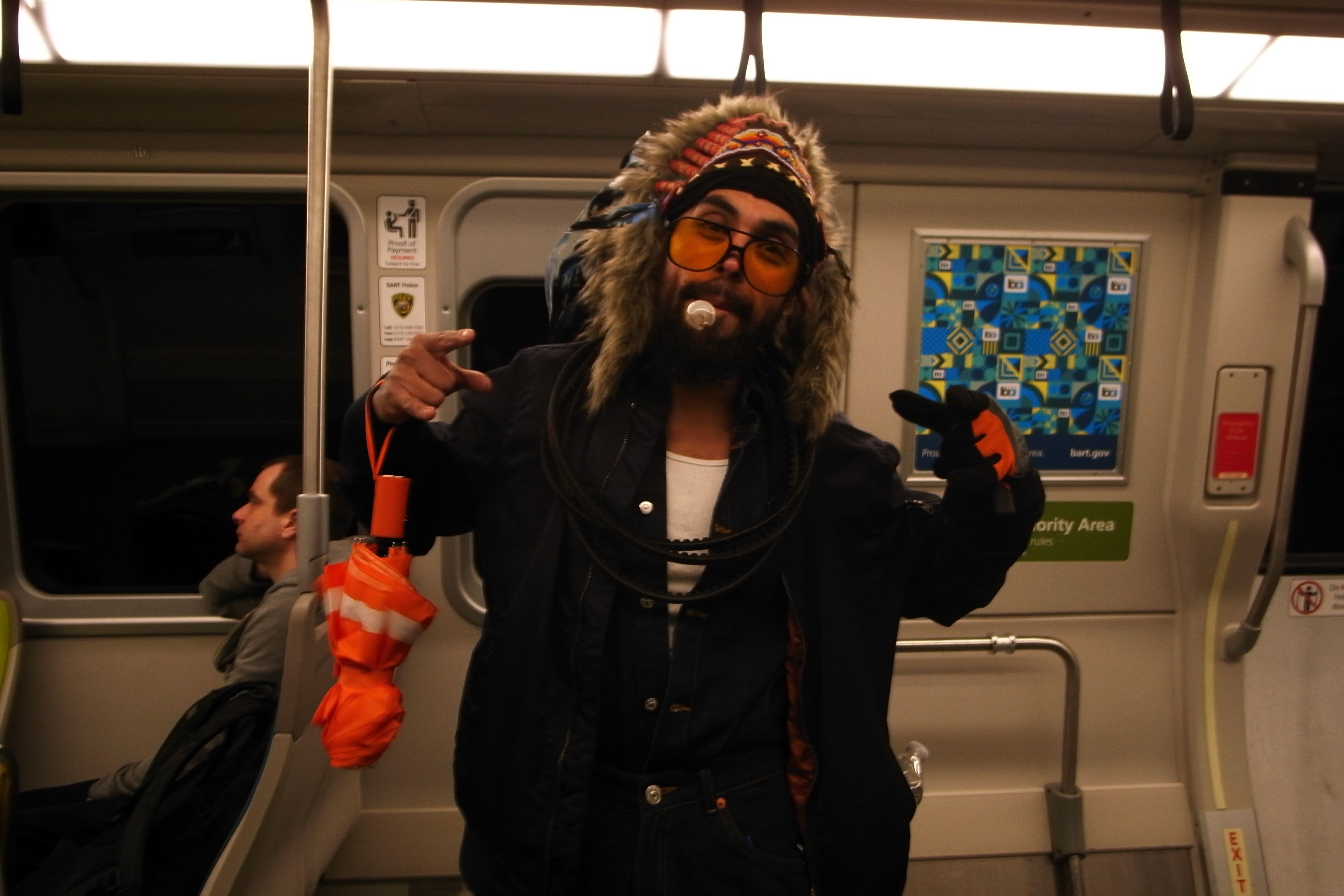 I flew into San Francisco Jan 1 2025 00:30 – we had champagne in paper cups on the plane. I landed in San Francisco and this guy was on the Bart with an Indian headdress and a crack pipe. I asked if I could take a picture of him he said hell yeah. First pic of 2025.