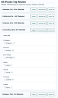 So then the question is how will I update this json file after a big road trip? The solution I came up with was to create another vibe coded mini-app that takes that same exported file that came from the checkbox app, and run it into a map app that also imports the census data so that I can add and take out places. I have a little "add place" button in the top right of the screen that I can press which opens up a modal that allows me to input a place, have the place autosuggested, and allows me to add the tag name. This will add it to a buffer, and if I press "export" it will add this new city to the json file. Then I supply that new json file in my website, and a new lat/long point comes up on the map. This point corresponds to a tag, and if you click on that point, then we open up the images that correspond to that tag in one of our aforementioned popups. That app looks like this:
